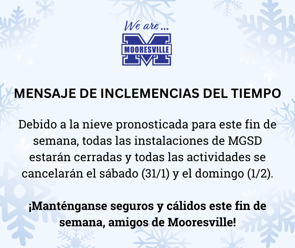 Due to the forecasted snow and the potential for hazardous road conditions, all Mooresville Graded School District facilities will be closed and all activities are cancelled this weekend, Saturday, January 31, and Sunday, February 1, 2026. Please stay safe and warm!